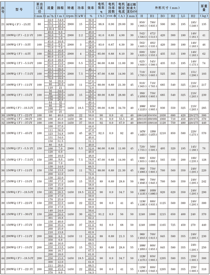 為了使WQ(F/JY)系列潛水污水泵以更好的可靠性、更高的機組效率服務于客戶,在總結25年生產制造該系列泵的經驗積累的基礎上,再一次更新優化了水力模型,創新機械密封、軸承結構,采用優質電機材料,根據使用環境條件,18.5kW及以上泵對電機循環冷卻,保證可靠性。全系列共111個基本規格,通過使用原型葉輪和改型葉輪及其切割,在型譜性能范圍內,可提供恰當滿足用戶所需要的任意流量、揚程工作點的水泵。